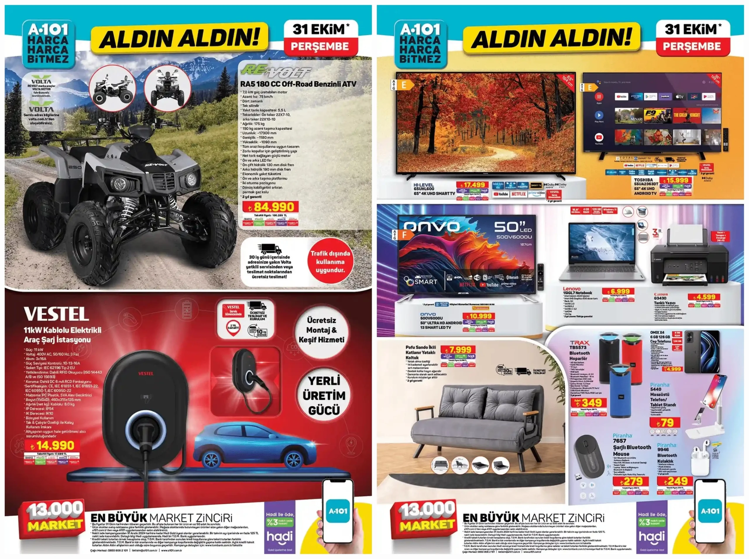 A101, uygun fiyatlı ürünlerle tanınan raflarında bu hafta oldukça dikkat çekici iki ürünle karşımıza çıkıyor. Vestel markalı 11kW gücünde bir elektrikli araç şarj istasyonu ve Volta ReVolt 180CC benzinli off-road ATV aracı, A101’in ürün yelpazesini genişletiyor.