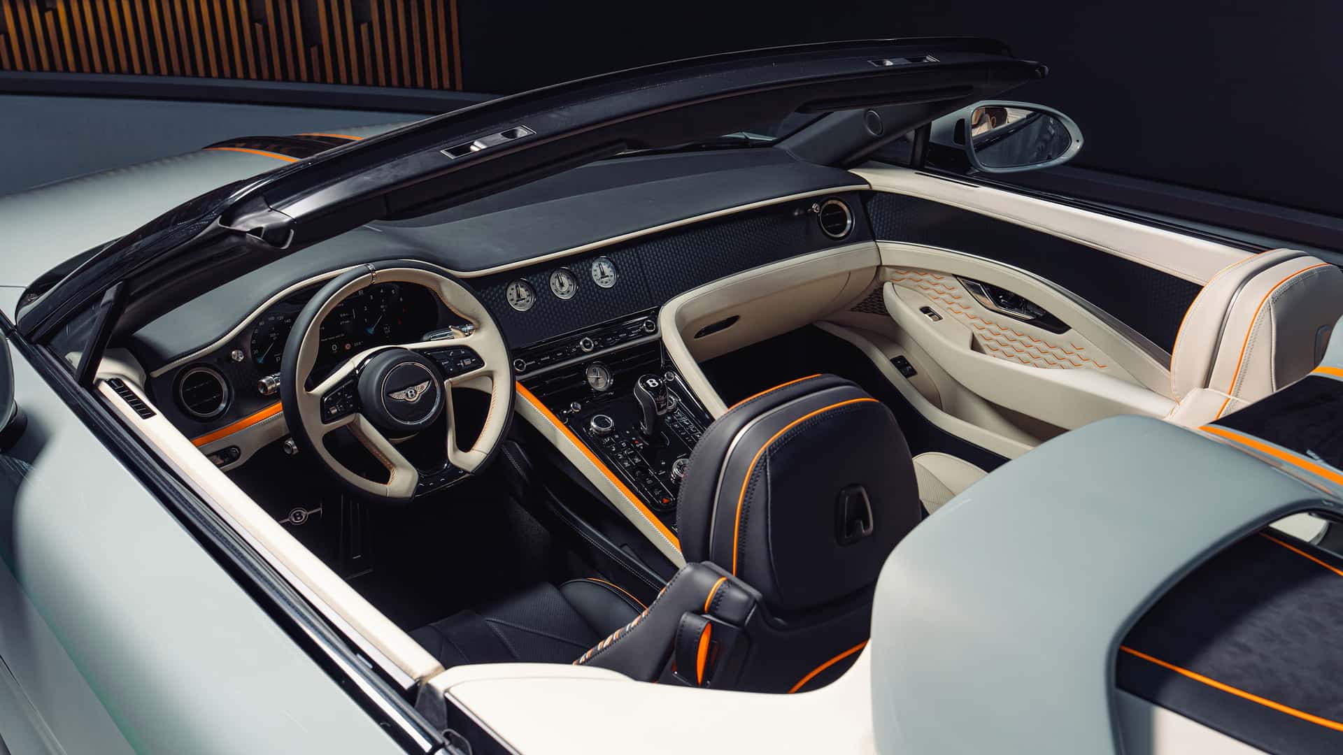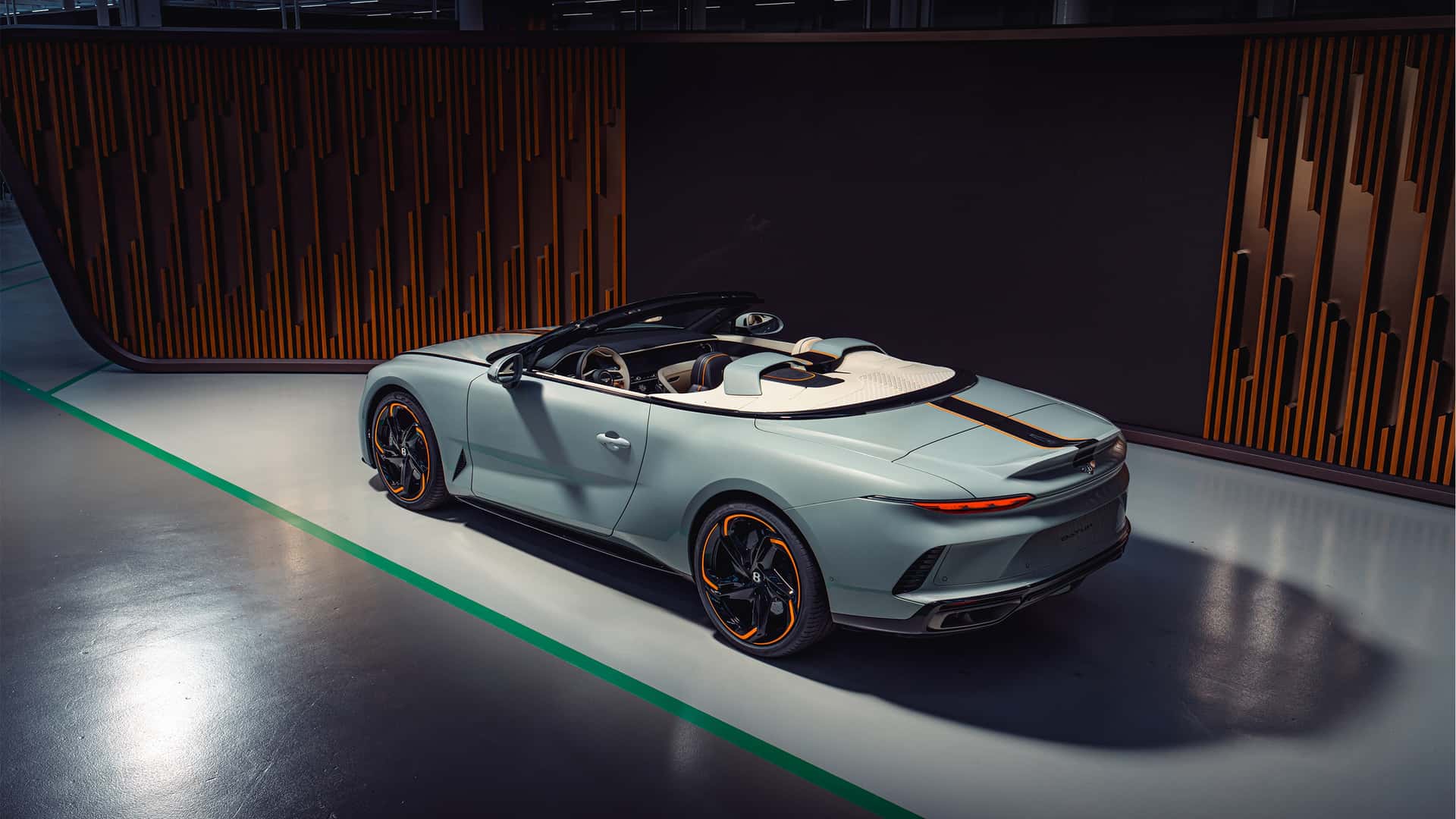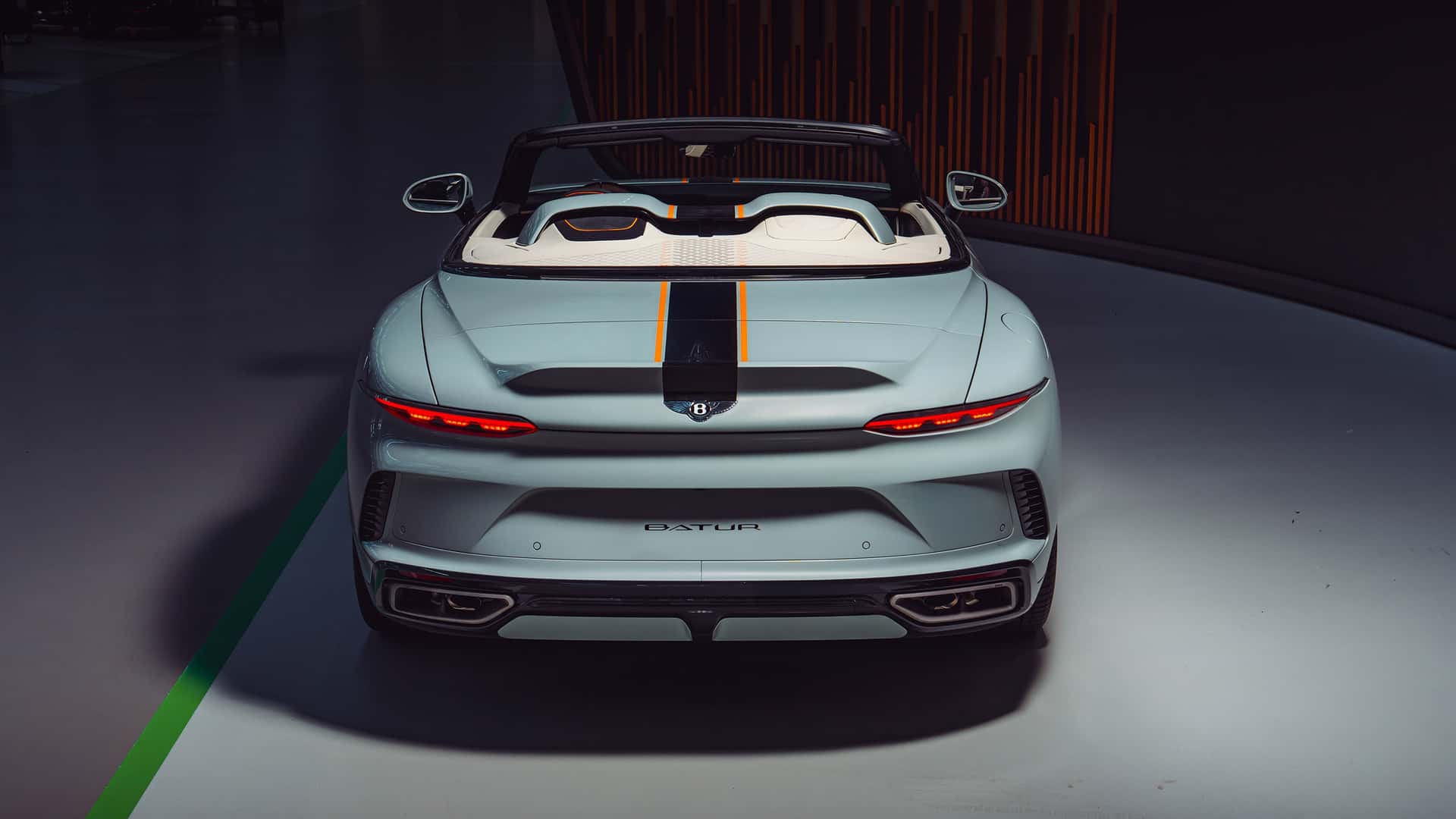Bu özel Batur Convertible, değişen gümüş tonlarıyla dikkat çeken Opalite rengi gövdesiyle öne çıkıyor. Gövde üzerindeki parlak siyah şeritler ve canlı Mandarin turuncusu detaylar, aracın sportif karakterini vurguluyor. Aynı vurgular, ön ızgarada ve beş kollu jantlarda da tekrarlanarak bütünlüklü bir tasarım dili oluşturuyor.