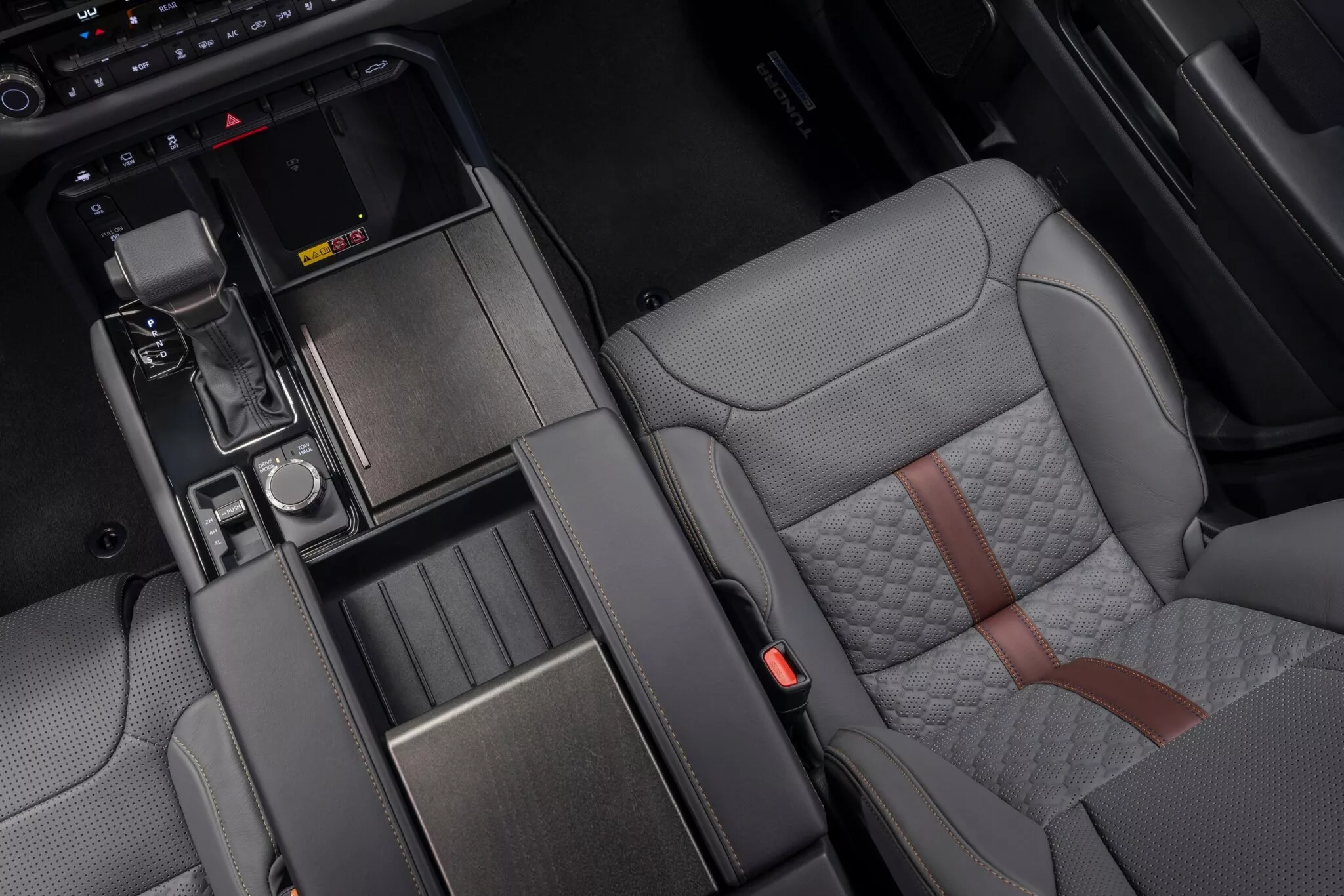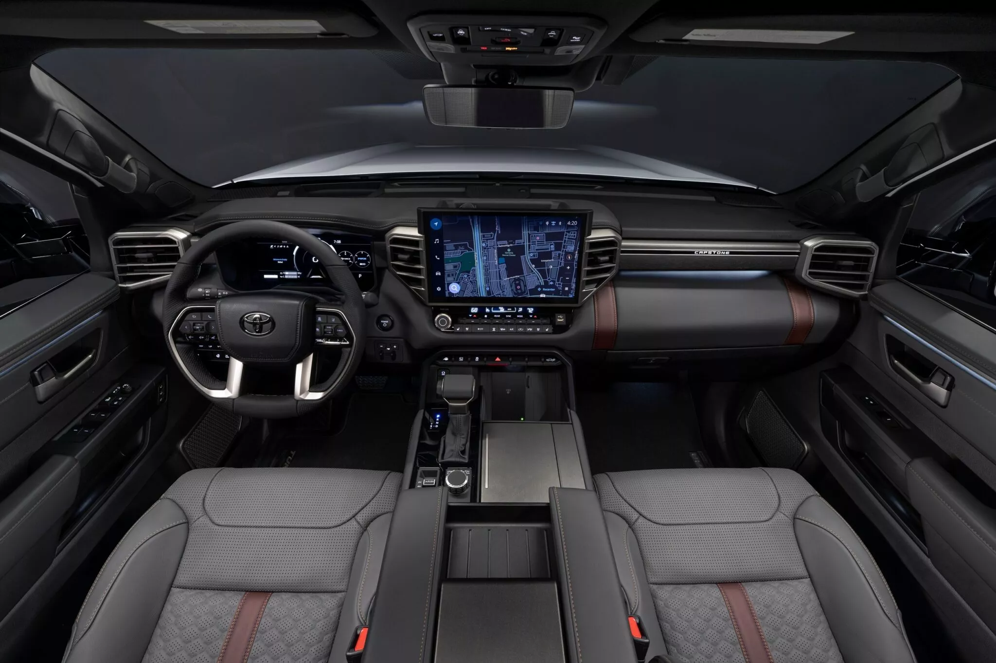 İç mekanda en fazla değişim Limited ve Capstone donanımlarında yaşandı. Limited, artık siyah veya gri renkli deri döşemelerle gelirken, Capstone versiyonu doku detaylı “Shale” renkli deri koltuklarla lüks bir his sunuyor. TRD Pro versiyonunda ise isteğe bağlı olarak Tacoma TRD Pro’da da bulunan ISO Dynamic koltuklar tercih edilebiliyor. Bu koltuklar arazi sürüşlerinde konforu artırmak için tasarlanmış.