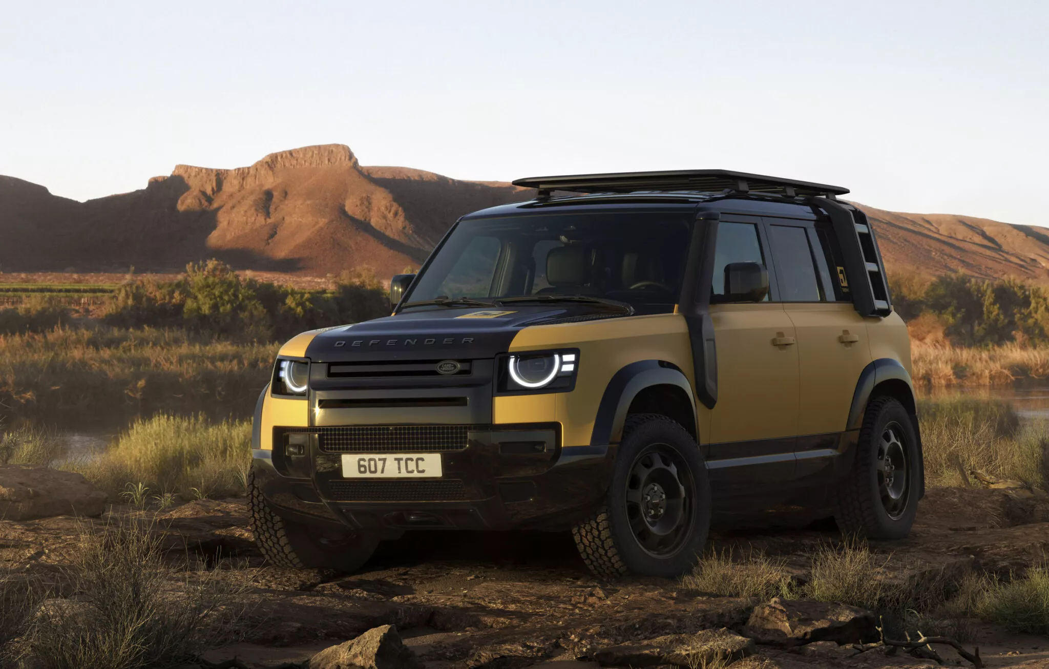 Defender 110 Trophy Edition, görsel olarak 1980-2000 yılları arasında düzenlenen ve zorlu doğa koşullarında gerçekleşen Camel Trophy yarışlarının ruhunu yaşatıyor. Deep Sandglow Yellow (kum sarısı) ve Keswick Green (zeytin yeşili) olmak üzere iki gövde rengi seçeneği sunulan araç, motor kaputu, çamurluk kemerleri ve alt gövdeye uygulanan parlak siyah detaylarla güçlü bir kontrast sunuyor. Ancak bu parlak yüzeylerin gerçek bir Camel Trophy parkurunda çok kısa sürede çizileceğini de hatırlatmak gerek. O nedenle, şehir içi kullanımlarda dahi opsiyonel olarak sunulan mat koruyucu film tercih edilebilir.